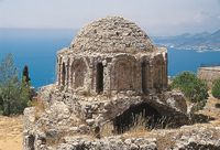 The Citadel is built 250 metres up, at the highest point of the rocky peninsula that juts out into the Mediterranean Sea. The sea protects it on three sides. It was built on the remnants of earlier Byzantine and Roman fortifications. Many of the cisterns are in good condition. Significant buildings inside the citadel include the Cold Water Bath and an old Christian Basilica.